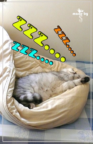 以一個很緩慢的姿態,拖著大屁股,爬上床鋪睡大覺(呼嚕呼嚕的睡)